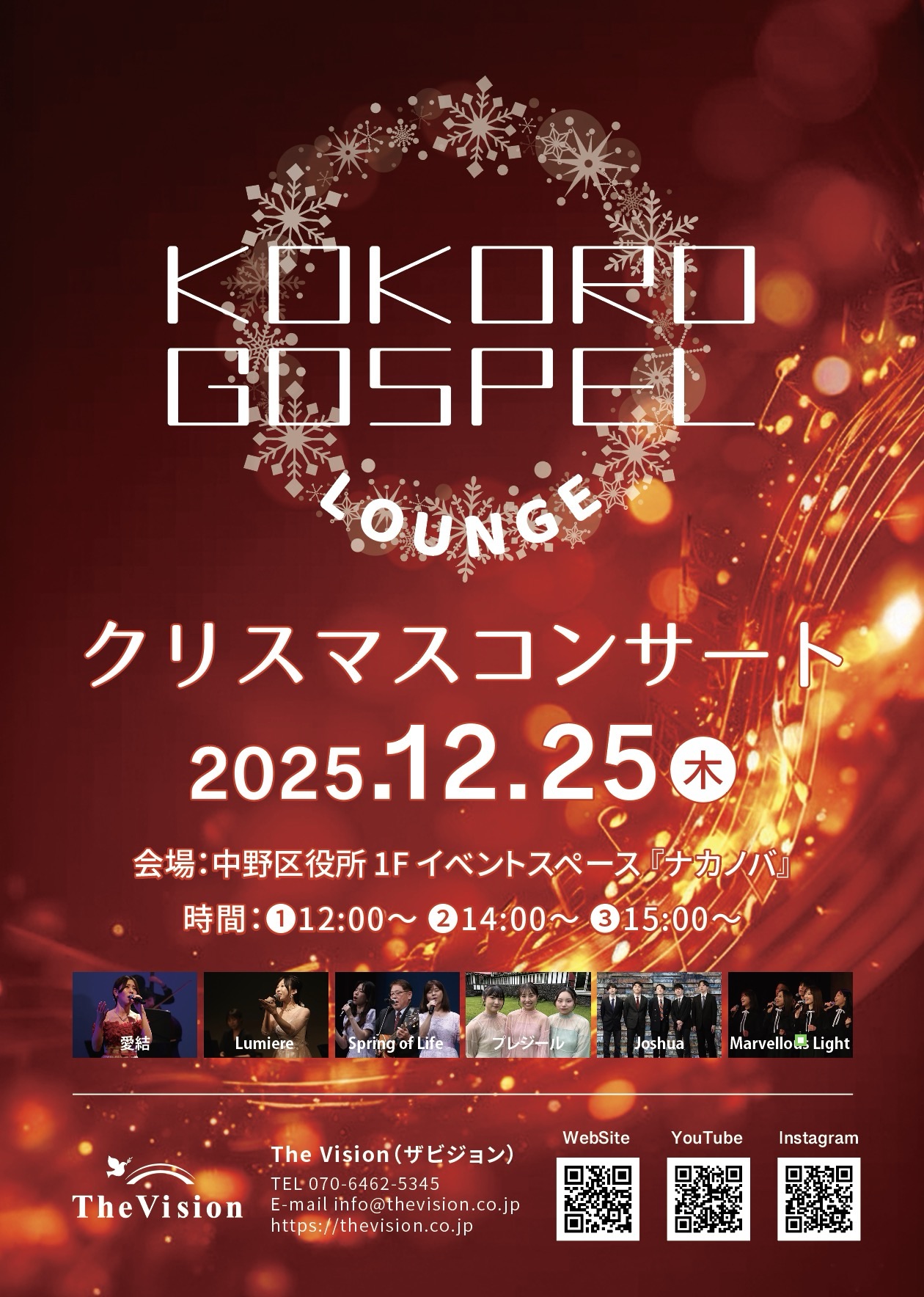 GOSPELLIVEヘッドライン信仰教会新着 「KOKORO GOSPEL LOUNGE~クリスマスコンサート~」開催 2026年1月3日 09:50 46 FacebookTwitter Screenshot 2025年12月25日、中野区役所1階のイベントスペース「ナカノバ」で、The Vision主催のゴスペルイベント「KOKORO GOSPEL LOUNGE~クリスマスコンサート~」が開催された。 当日は、愛結、Lumiere、Sprin この記事は有料記事です。 いますぐ登録して続きを読む 既存ユーザのログインユーザー名またはメールアドレスパスワード ログイン状態を保存する